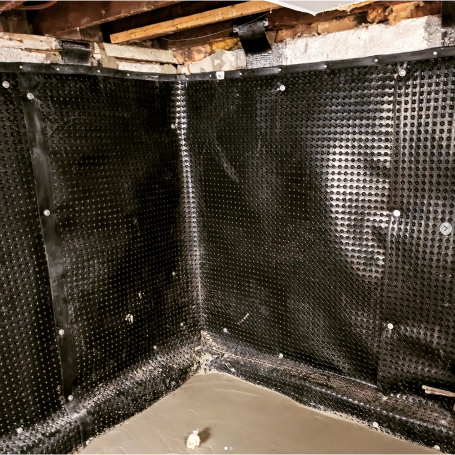 Once cured, remove timber forms and fasten drainage board to foundation wall using concrete anchors. Install a fresh 4″ perforated weeping tile system with filter cloth.